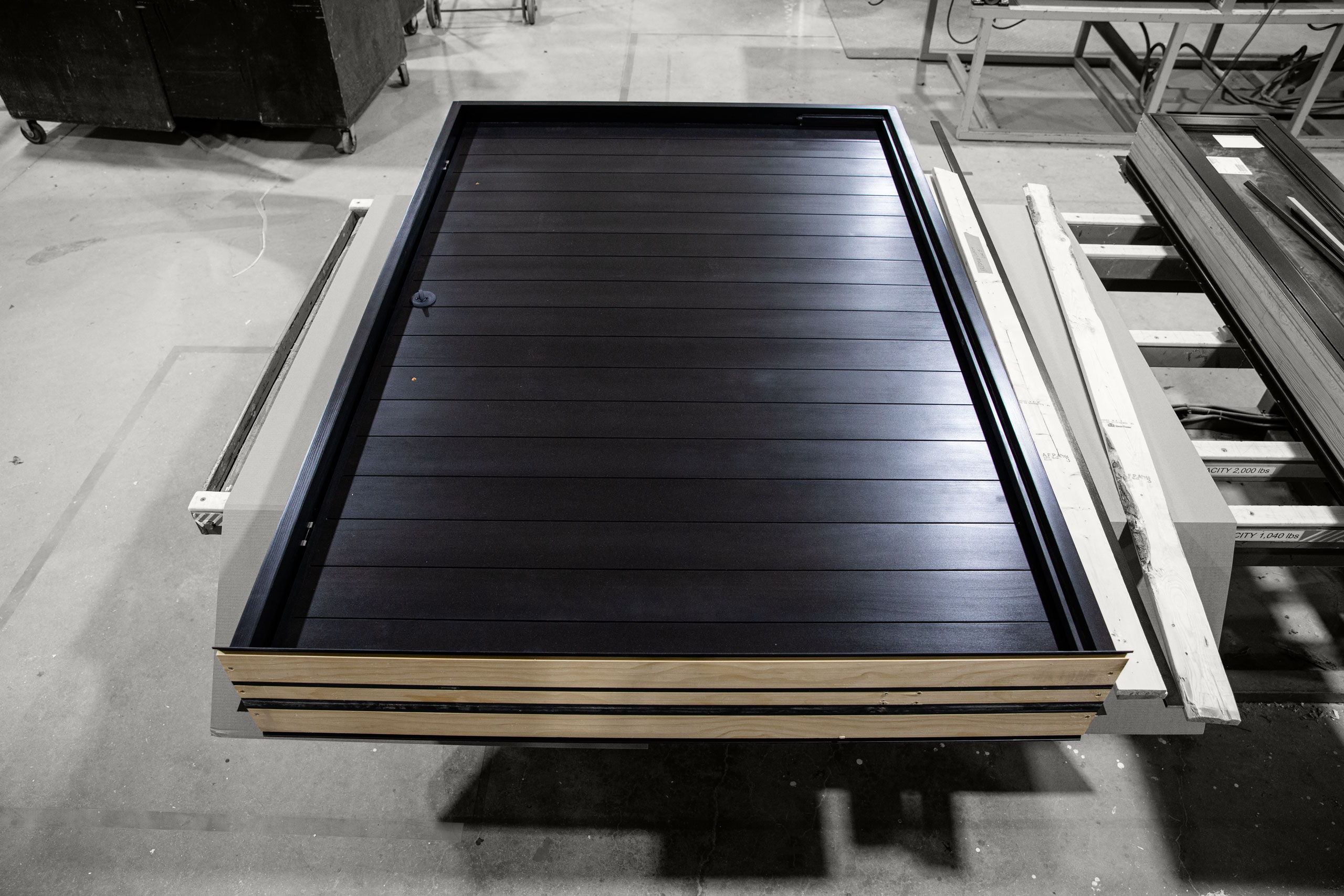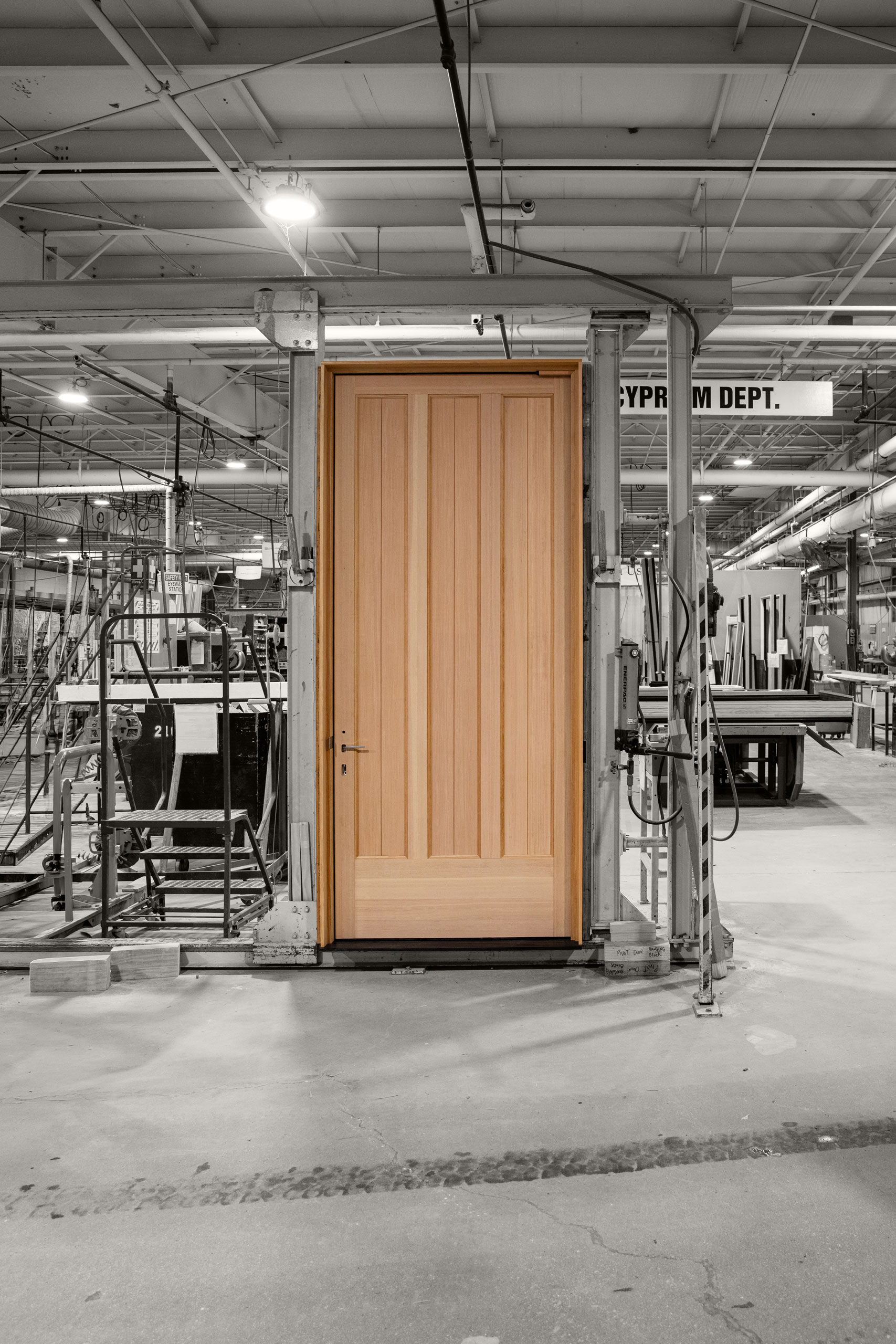 This pivot door, though you can’t tell, is a plank panel design, beautiful vertical battens hide the grooves between the vertical planks. This door was ultimately going to be painted in our Jet Black paint, but here you’re seeing it in its gorgeous raw Coastal Douglas Fir state. This door includes a self-closing hinge, long vertical pull-bar, and a simple thumb-turn to lock the door.